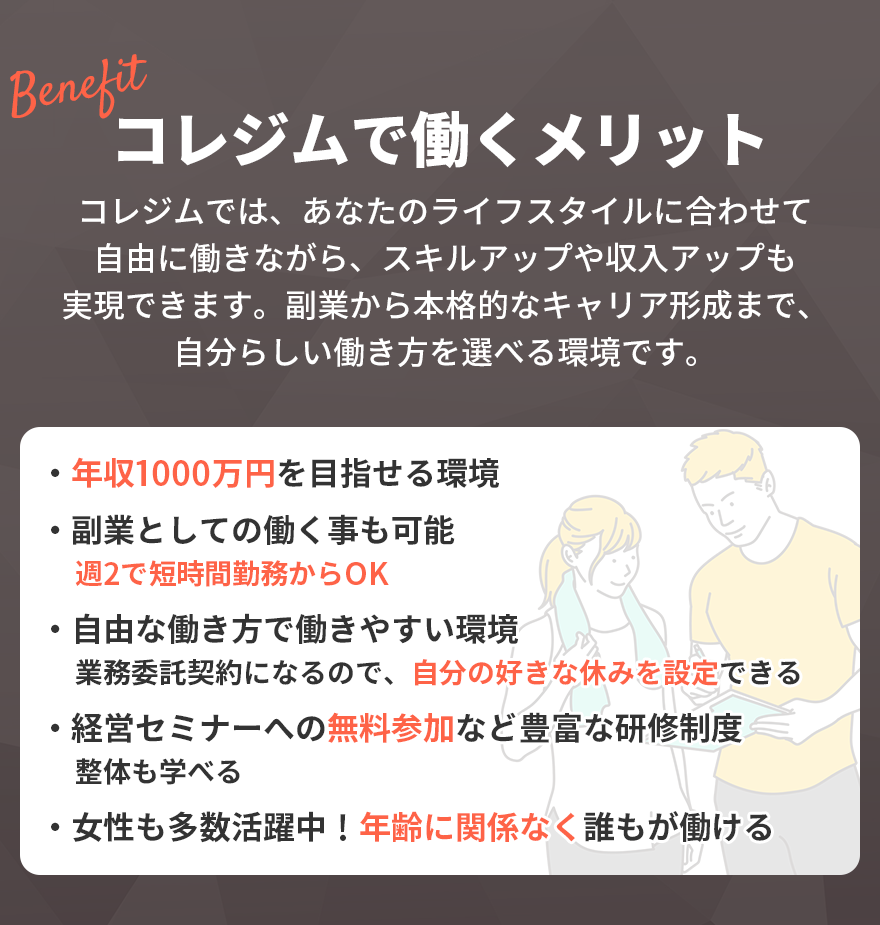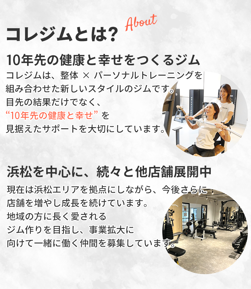 トレーニング指導はもちろん、カウンセリング・接客・売上管理など、“人を動かす力”を学べるのがコレジムの特徴です。